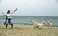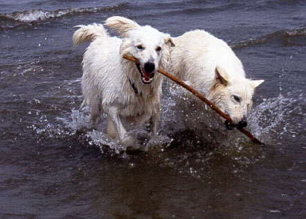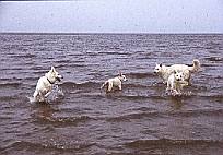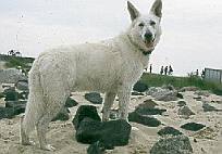 Auf dem Parkplatz in Cuxhaven stand bereits ein weißer Schäferhund. Auf einen kurzen Zuruf reagierten die Besitzer extrem irritiert, im folgenden Gespräch stellte sich heraus, dass sie zufällig hier waren und von dem Treffen gar nichts wußten. Sie schlossen sich uns aber sofort begeistert an. So hatten wir schnell 14 Weiße Schäferhunde beisammen und machten uns auf den Weg an den Strand. Wie üblich, waren die Hunde kaum zu halten, als sie das Wasser sahen. Besonders freuten wir uns über den Besuch unserer norwegischen Freunde, die Verwandte in Cuxhaven besuchten und mit ihrem Weißen Schäferhund an unserem Treffen teilnahmen. Der "Norweger" ist allerdings ein Einwanderer aus deutscher Zucht.