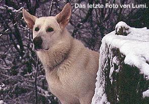 Am 16. Januar bekam Lumi eine Schmerzattacke, die wir vorher in dieser Form noch nicht erlebt hatten. Er weinte, er schrie. Wir gaben Aspirin, die nur wenig halfen. Unsere Kinder und ihre Freunde saßen bei ihm und weinten. Unsere älteste Tochter Malin konnte ich kaum beruhigen. Lumi bekam eine Schmerzspritze, zu mehr konnten wir uns noch nicht entschließen, obwohl der Tierarzt bereits die Vermutung äußerte, wir hätten es mit einer beginnenden Hirnhautentzündung zu tun. Bisher waren die Schmerzen auch am nächsten Tag vorbei. Wir klammerten uns verzweifelt an die Hoffnung, obwohl wir alle ahnten, dass wir am Ende des gemeinsamen Weges angekommen waren. Am Donnerstag waren die Schmerzen anscheinend vergangen - oder die Spritze wirkte noch. Lumi hatte die Dosis für einen 75-kg-Hund bekommen. Er war bis Mittags benommen. Abends griff er Fiala an. Unvermittelt und in einer Weise, dass wir trennen mussten. Fiala versuchte auszuweichen. Früher hatte sie sich solchen Auseinandersetzungen immer gestellt. Jetzt wich sie aus. Ein weiteres Indiz für uns, dass etwas ganz und gar nicht in Ordnung war. Als ich Lumi ansprach, bedrohte er mich. Er fixierte mich, stand langsam auf und ging auf mich zu. Um sich im nächsten Moment auf den Rücken zu werfen und sich kraulen zu lassen.