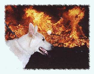 Ostern 2001 war denkwürdig. Am Tag des Osterfeuers schneite es und es war bitterkalt. Durch die Feuchtigkeit kam das Feuer nicht richtig in Gang. Es gibt im Dorf nur ein Osterfeuer, dies nimmt aber locker eine Fläche von 8-10 m² ein. Lumi zeigte keinerlei Interesse am Feuer, er interessierte sich mehr für die Leckereien, die dort verkauft wurden und für die Kinder, die ihn inzwischen von einem Kindergartenbesuch und auch von den Spaziergängen her kannten. Schließlich kam einer der Landwirte, um das Feuer "in Schwung zu bringen". Lumi war voll bei der Sache und versuchte, ihm das brennende Heu von der Forke zu stibitzen. Als die Äste auf einer Breite von 5-6 m Feuer fingen, wichen wir einige vor der Hitzewelle einige Meter zurück. Lumi blieb sitzen und schaute ins Feuer. Er war ein absolut ungewöhnlicher Hund. Schwarz gefärbt vom Ruß traten wir spätnachts alle den Heimweg an.