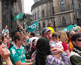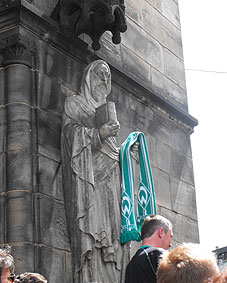 Nach fast drei Stunden Ausharren ... naja, eigentlich war's mehr eine Mischung aus Jubel, Mitsingen, Partymachen und einen besseren Ausguck suchen. Gut, dass die Domheiligen stabil gebaut sind, manch ein Heiliger hatte plötzlich einen Werderfan auf dem Schoß.