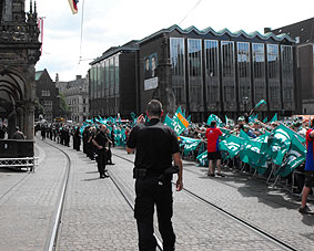 Weiter gehts zum Dom. Wir hofften, dort einen besseren Blick auf den Rathausbalkon zu haben, ohne in's Gedränge zu geraten. Die Dommauern im Rücken geben Sicherheit.