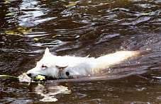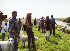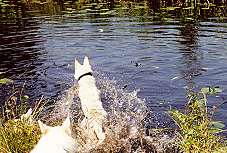 Als wir über die nächste Wiese gingen, ertönte hinter uns wildes Gehupe und mit quietschenden Reifen hielt ein Auto hinter uns. Der Fotograf der Lokalzeitung hatte uns doch noch aufgespürt. DA uns keine der angeschriebenen Zeitungen eine Zusage geschickt hatte, haben wir auf die Reporter auch keinerlei Rücksicht genommen. Schnell war die "Nachhut" der Truppe zusammen getrommelt und die Hunde wurden für ein Gruppenfoto in Pose gesetzt bzw gestellt. Danach ging es weiter in die Richtung, wo es laut Campingaufsicht Wasser geben sollte. Denn bei den Temperaturen auf dem sonnigen Weg schien Wasser wirklich eine gute Lösung. Bereits von weitem hörte man das Platschen, Bellen und Quietschen der ersten Hunde, die den Wassergraben erreicht hatten. In sehr weiser Voraussicht hatte ein Landwirt auf dem Nebenacker Mais gepflanzt. Die Maiskolben gaben ein beliebtes Wurfobjekt ab, dem die meisten Hunde nur zu gerne ins Wasser nachsprangen. Die Welpen Fynn und Lumi sprangen zwar todesmutig auch ins kühle Nass, hatten danach aber ihre Probleme, wieder hinaus zu kommen, da das Ufer an einigen Stellen sehr steil war.