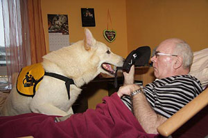 I would like to tell you about one visit to show the importance of good trained and absolutely friendly dogs. It is very necessary to test the dogs before a team starts to such visits. The patients are not necessarily in bed. One of them sat in a wheelchair at the window, with a very small chink between bed and wheel-chair. The chink was wide enough for Karhu. The man took the ball at once, put him on his legs .... slowly it rolled down to the feet. It needed some coordination for this movement, I knew this was quite extraordinary for this man. I sent my daughter Malin out to look for the nurse, the teamwork between the man and Karhu was quite unbelievable. I did not think about Karhus reaction. He was irritated (something wellknown leaves), but he soon came back to the man and continued playing. It happened when Malin came back: Karhu tried to run to Malin, had to pass the chink. The patient reacted fast: the hand cramped in Karhus neck. Karhu stood still, looked at me. He yawned, he moaned, it was obviously quite painful for him. I put he arm around him and tried to take the fingers out of his coad. It was a kind of spasm, it was very hard to get the hand off. One finger after another, it took so long. As soon as Karhu was free, he ran to Malin. She told him to be the best dog of the world and started laughing. Now the hand cramped around my arm and I got an impression about the pain Karhu must have felt. Some minutes later the nurse came and Karhu demonstrated once again his game with this man. An alike situation is simulated in the clubs (Tiere helfen Menschen) test. When Karhu had to pass I thought that this is quite difficult for a dog. Now I am thinking different. A therapy and also a compagnion dog must be able to accept even painful situations caused by a strange person. He never ever is allowed to show an aggresive reaction. Which underlines the confidence to their team partner as well as a friendly and harmless temperament. Meanwhile we have four patients in the PVS area. The visits are always very different, also depending on the PVS state they are in. Sometimes all of them are sleeping. Then we come back to the "old" ways in the home or we are visiting the dement area. I have learnt a lot during the past months. I did not know a lot about PVS before, thought about people, being in bed the whole day starring at the feeling and not able to react in any way. This is completely wrong and it is sometimes difficult to accept this knowledge. Literature and own experiences (as far as I can talk about experiences after such a short time) I am sure that these people know where they are, they know what is happening around but they have lost lot of the ability to communicate. "They see and feel more than we can imagine", I read on an internet site and yes, I agree. What a destiny - not to be able to express emotions by talking or movements. Even for the relatives, sitting beside a loved person for hours and hours for days, months and years. I have met some relatives who had to change their lifes - for a hope only. Each time I am on "Station IV" I am concnerned. And I am sorry we cannot help more. Two years later .... Two years have passed by since we first went through the glass door. These visits are still something special, I never know what happens. But meanwhile I see some things quite different. So many things in everyday life make us upset and angry ... and here you realize how fast life can change into something completely different and those "big" problems are replaced by really big problems. Many times I felt small compared with the power and will these patients and their relatives need and have. You realize that relatives and partners often have hopes .... they hope the dog may change something and deep inside they know this wish will not come true. These people are so warmhearted, so friendly even though life is treating them that hard. I am glad for this experience, this knowledge and I nevertheless I am so happy to have a healthy family. One patient is very special to me. The poster at his wall showing his cat inspirated us to present "Miss Marple" to him. A try, crazy enough: cats are no dogs, they are not used to follow. I asked the nurse, she grinned and accepted my idea. The first visit was very special. Miss Marple, grown up for the first 6 weeks on a farm, meanwhile nearly one year old, changed from a wild and playing young cat to a calm and satisfied cat. She lay down on the patients' knees. Miss Marple, quite shy to strangers, accepted the hands touching her coat - she even liked it. Whenever it is possible, Miss Marple comes with us and we can be sure, she jumps on the bed and enjoys the attention she gets. Something she never does at home. Both, Miss Marple and Karhu belong to the PVS station meanwhile. Sometimes it is difficult to reach this door, because we have to pass some other floors with aged people. Whenever Karhu barks or squeeks the doors are opening for him. The joy and the bright eyes, when the aged people see Karhu, is the best possible loan for our work. For our new book about white shepherds we got the permission to take and to publish some photos. It is always quite difficult to get these permissions, so we are glad and proud to be able to show some impressions of our work. The photos have been taken in February 2010 by Peter. F Copyright: Gaby von Döllen, Worpswede (2010) |