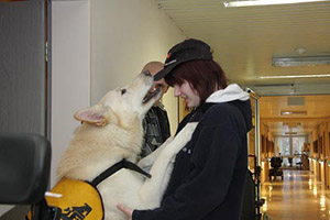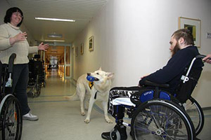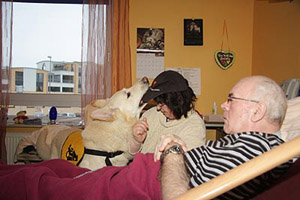 People, living in this part, have passed a long time in hospitals and special clinics. There are different phases from A to F. A means an acute state of PVS. These people usually are in hospital in intensive care. The people in this home are in phase "F", they are in PVS state for a longer time, sometimes already for many years and the hope is very small that they might be able to return to a normal life. The longer the PVS state lasts the less are the chances that these people will recover. They get help by physiotherapy, ergotherapy, smell therapies ... yes ... and from Karhu. There are different messages about their feelings and it is a subject that is still discussed. However, probably these people realize their situation, their environment and what happens around quite well. They simply have lost the ability to move, to speak (dependent on the part of brain damaged), the minimal signs they can give must be enough for nurses, relatives and visitors to realize what they want to say. The club member working with coma people already pointed out on the phone that we have a big responsibility. Just imagine, somebody puts a big spider on your arm, you realize, she is walking up to your shoulder. You are scared to death but you cannot cry, you cannot tell that the situation is awful and fightened for you. A coma patient with a dog phobie or even a fear of dogs will be scared when a big dog enters the room. 'Just try!', is an absolute wrong way. It is our responsibility to leave the dog only in when we exactly know that this person had a good relationship to dogs. The nearer and more intensive he had contact in his "former" life, the better chance our dog has to get contact. Expectations - Hopes - Disappointments A person who finds back to life because of our dogs' visit, this is a miracle. This will probably never happen. A person who shows a reaction, who shows in some way that he likes the visit, this could become real. Not always, but perhaps.. Numerous visits in rooms whose people are starring at the ceiling. Doubts that they realize you are here: this will happen quite often. "You must be quite courageous to enter this floor", I was told. "I have the chance to decide", I answered. "these people - and their relatives - did not have this chance." My visits have some more details. Realtives, partners, children and friends, they hope for years. They see every small change in behavement. People, visiting their partner daily, for years and years, giving up a big deal of their own lifes. For their loved partner who -perhaps- realizes their visit. They all are looking to the dog with a hope and an expectation, he can never ever fulfil. Disappointments are happening much more often than miracles. Time stands still ... experiences A light and friendly room, coloured in yellow and orange. A thin curtain blowing in the wind, you can smell the spring through the open window. The TV is on. On the right at the wall a paper with the favourite programs. First impressions. A very private and familiar enviornment, perhaps destroyed by Karhu and me. Is it allowed to enter? We will never know. The nurse puts up the ladies head. She starts coughing awfull. A short word to Karhu and we are leaving the room. Shocked, irritated. Was it a fault to enter? "It's okay", the nurse stated. "Today she had a lot of dates. Each visit means a lot of mental work for these people. I think it was too much. In any case she is not afraid of dogs. She had no dog of her own but some cats. " I am not quite sure and will leave Karhu in front of the door next time. The next room looks similar. Karhu waits in front of the (open) door. We are explaining who we are, who Karhu is. The nurse tells me that this lady had some boxers. I told that Karhu is a shepherd but a special one because he is white. 'Do you want to see him?' I ask her. She is still starring at the ceiling. No reaction. The nurse says "ok" and leaves the room. Well, simply perfect.... Karhu enters the room, looks at me, gets no information and starts looking around. He realizes the ball on my knees. KArhu and I start playing an bit, I put the ball on the bed. Karhu looks at the lady. A new situation, the confrontation with a person who shows absolutely no reaction. He is irritated, looks at me. 'Help', he seems to say. 'Do, whatever you want', I try to tell him. Karhu sits still and starts squeeking, jawning. Instinctively, he tries to get the attention. And he is successful: the head turns a bit, her eyes seem to see Karhu. The lips seem to say a word. "You like it, don't you?" - I was so fascinated, I did not realize the nurse entering the room. "Take it - careful!" Karhu jumps with two legs on my leg and takes the ball from the bed. The lady still looks at Karhu. We repeat it some times, then she shuts her eyes. The nurse whispers: "It's enough now." "You are quite welcome in this room", she says and that this lady can show a "NO!" quite clear. In the third and last room I survived a surprise. A man, looking at me and realizing that I am there. Karhu runs to the bed and puts down the ball. I put the ball into his hand. The man raises the hand. Karhus reaction is prompt and I have to stop him by a handsign. I do not want the dog to jump into the bed! Not on his first day! The nurse smiles at me. I hesitate to give Karhu to ok. "Life can be dangerous", answers the nurse as I told that Karhu somestimes seems to have piranha-genes. But Karhu puts a paw on the bed. When his nose approaches the ball, the patient takes his hand (and the ball) away, no longer reachable for Karhu. Karhu runs to the other side of the bed. The hand moves into the opposite direction. Karhu understands the game, once again he jumps with one front paw on the bed, gets a little piece of the ball and pulls. Hard to breath in this situation, I am standing, prepared to interrupt at once. But millimeter for millimetre Karhu divides the ball from the hand by pulling. I never saw him acting that caref