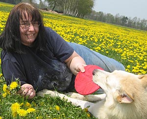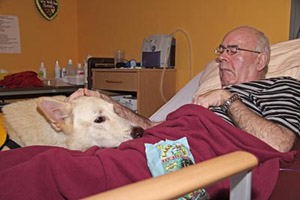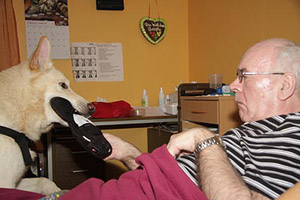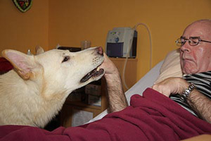 I would like to tell you about one visit to show the importance of good trained and absolutely friendly dogs. It is very necessary to test the dogs before a team starts to such visits. The patients are not necessarily in bed. One of them sat in a wheelchair at the window, with a very small chink between bed and wheel-chair. The chink was wide enough for Karhu. The man took the ball at once, put him on his legs .... slowly it rolled down to the feet. It needed some coordination for this movement, I knew this was quite extraordinary for this man. I sent my daughter Malin out to look for the nurse, the teamwork between the man and Karhu was quite unbelievable. I did not think about Karhus reaction. He was irritated (something wellknown leaves), but he soon came back to the man and continued playing. It happened when Malin came back: Karhu tried to run to Malin, had to pass the chink. The patient reacted fast: the hand cramped in Karhus neck. Karhu stood still, looked at me. He yawned, he moaned, it was obviously quite painful for him. I put he arm around him and tried to take the fingers out of his coad. It was a kind of spasm, it was very hard to get the hand off. One finger after another, it took so long. As soon as Karhu was free, he ran to Malin. She told him to be the best dog of the world and started laughing. Now the hand cramped around my arm and I got an impression about the pain Karhu must have felt. Some minutes later the nurse came and Karhu demonstrated once again his game with this man. An alike situation is simulated in the clubs (Tiere helfen Menschen) test. When Karhu had to pass I thought that this is quite difficult for a dog. Now I am thinking different. A therapy and also a compagnion dog must be able to accept even painful situations caused by a strange person. He never ever is allowed to show an aggresive reaction. Which underlines the confidence to their team partner as well as a friendly and harmless temperament. Meanwhile we have four patients in the PVS area. The visits are always very different, also depending on the PVS state they are in. Sometimes all of them are sleeping. Then we come back to the "old" ways in the home or we are visiting the dement area. I have learnt a lot during the past months. I did not know a lot about PVS before, thought about people, being in bed the whole day starring at the feeling and not able to react in any way. This is completely wrong and it is sometimes difficult to accept this knowledge. Literature and own experiences (as far as I can talk about experiences after such a short time) I am sure that these people know where they are, they know what is happening around but they have lost lot of the ability to communicate. "They see and feel more than we can imagine", I read on an internet site and yes, I agree. What a destiny - not to be able to express emotions by talking or movements. Even for the relatives, sitting beside a loved person for hours and hours for days, months and years. I have met some relatives who had to change their lifes - for a hope only. Each time I am on "Station IV" I am concnerned. And I am sorry we cannot help more. Two years later .... Two years have passed by since we first went through the glass door. These visits are still something special, I never know what happens. But meanwhile I see some things quite different. So many things in everyday life make us upset and angry ... and here you realize how fast life can change into something completely different and those "big" problems are replaced by really big problems. Many times I felt small compared with the power and will these patients and their relatives need and have. You realize that relatives and partners often have hopes .... they hope the dog may change something and deep inside they know this wish will not come true. These people are so warmhearted, so friendly even though life is treating them that hard. I am glad for this experience, this knowledge and I nevertheless I am so happy to have a healthy family. One patient is very special to me. The poster at his wall showing his cat inspirated us to present "Miss Marple" to him. A try, crazy enough: cats are no dogs, they are not used to follow. I asked the nurse, she grinned and accepted my idea. The first visit was very special. Miss Marple, grown up for the first 6 weeks on a farm, meanwhile nearly one year old, changed from a wild and playing young cat to a calm and satisfied cat. She lay down on the patients' knees. Miss Marple, quite shy to strangers, accepted the hands touching her coat - she even liked it. Whenever it is possible, Miss Marple comes with us and we can be sure, she jumps on the bed and enjoys the attention she gets. Something she never does at home. Both, Miss Marple and Karhu belong to the PVS station meanwhile. Sometimes it is difficult to reach this door, because we have to pass some other floors with aged people. Whenever Karhu barks or squeeks the doors are opening for him. The joy and the bright eyes, when the aged people see Karhu, is the best possible loan for our work. For our new book about white shepherds we got the permission to take and to publish some photos. It is always quite difficult to get these permissions, so we are glad and proud to be able to show some impressions of our work. The photos have been taken in February 2010 by Peter. F Copyright: Gaby von Döllen, Worpswede (2010) |