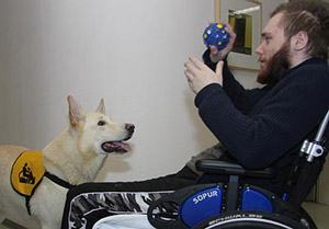 It was a quite strange feeling when I opened the glass door leading to the PVS rooms of the home for aged and handicapped people. Karhu and I, meanwhile a wellknown and welcome team, started to a new chapter in our therapy work. I put my hand on Karhus coat, his reaction was an irritated look up to my face. "What's wrong?", he seemed to ask. "Everything's ok", I answered. "It is not necessary to whisper. We are all happy when nice people - and doggies - come for a visit", I was told. A short talk to the doctor and the nurse, then we opened the first door. This "adventure" started with a meeting between the homes' leader and me. The home leadership planned some rooms for people in persistant vegetative state. It needs special presupposes and authorizations but first of all, they asked me whether I could 'work' with Karhu in this part. Of course, they knew us quite well, after 5 years regular visits. But PVS ... Somebody, who seems to sleep for ages and the target to bring this man or woman back to life. A target that will stay a dream in most cases. I sat at the table, unable to move, thinking about my answer. Karhu, cool as always, on the floor, starring at the goodies on the table. A strange feeling ... will I be able to come along with this situation? Will Karhu be able to work with this kind of people? It was my part to answer, the leader would accept a "no", he told me. I asked for some time. I needed more information - about coma, about dogs working in this part. The evening and the next day I spent by surfing and looking for information. Soon, I got a contact by 'my' club "Tiere helfen Menschen". All active members are honorary working in different parts (prisons, hospitals, schools...). Perhaps one of them does already something similar. And there was somebody - long telephone calls taking away lots of illusions but also giving lots of important information. Half a year passed by. The leadership of the home changed and I was still working with the aged people. Because of the death of Karhus most loved man our work became a bit boring. This man had always been there when Karhu came and he loved to work with him. Karhu and he became a good team: Karhu took goodies from his head, he nearly jumped into the wheel-chair, he trew the wheel-chair though the floors and played a kind of frisbee outside in summer. His death changed a lot, Karhu missed him, he looked for him each time we went to the home. Anyway, undoubless Karhu gave some special highlight to his life. And this is why we are doing this job. We had to reorganize or work. Finding new people ... sometimes nobody was interested and we drove home without any playing. The program in this home offers so many things that often enough all people were playing bingo, singing or something else. A disadvantage of my "come whenever you want". Then one visit changed everything. I had planned a short stay, Karhu was playing in the entrance area when the leader came to us. The PVS rooms were ready and the first people had moved. Furthermore, the dement people had asked for visits. Some minutes later - without being able to think much longer about it - Karhu and I stood in front of the glass door in the first floor. Now I took profit from all the things I had learnt in the summer. A big black spider on the arm ...