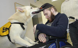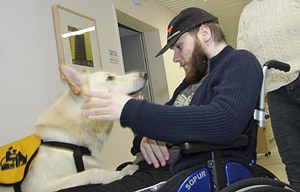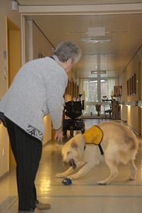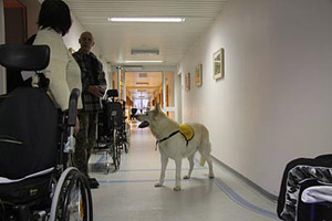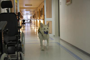 People, living in this part, have passed a long time in hospitals and special clinics. There are different phases from A to F. A means an acute state of PVS. These people usually are in hospital in intensive care. The people in this home are in phase "F", they are in PVS state for a longer time, sometimes already for many years and the hope is very small that they might be able to return to a normal life. The longer the PVS state lasts the less are the chances that these people will recover. They get help by physiotherapy, ergotherapy, smell therapies ... yes ... and from Karhu. There are different messages about their feelings and it is a subject that is still discussed. However, probably these people realize their situation, their environment and what happens around quite well. They simply have lost the ability to move, to speak (dependent on the part of brain damaged), the minimal signs they can give must be enough for nurses, relatives and visitors to realize what they want to say. The club member working with coma people already pointed out on the phone that we have a big responsibility. Just imagine, somebody puts a big spider on your arm, you realize, she is walking up to your shoulder. You are scared to death but you cannot cry, you cannot tell that the situation is awful and fightened for you. A coma patient with a dog phobie or even a fear of dogs will be scared when a big dog enters the room. 'Just try!', is an absolute wrong way. It is our responsibility to leave the dog only in when we exactly know that this person had a good relationship to dogs. The nearer and more intensive he had contact in his "former" life, the better chance our dog has to get contact. Expectations - Hopes - Disappointments A person who finds back to life because of our dogs' visit, this is a miracle. This will probably never happen. A person who shows a reaction, who shows in some way that he likes the visit, this could become real. Not always, but perhaps.. Numerous visits in rooms whose people are starring at the ceiling. Doubts that they realize you are here: this will happen quite often. "You must be quite courageous to enter this floor", I was told. "I have the chance to decide", I answered. "these people - and their relatives - did not have this chance." My visits have some more details. Realtives, partners, children and friends, they hope for years. They see every small change in behavement. People, visiting their partner daily, for years and years, giving up a big deal of their own lifes. For their loved partner who -perhaps- realizes their visit. They all are looking to the dog with a hope and an expectation, he can never ever fulfil. Disappointments are happening much more often than miracles. Time stands still ... experiences A light and friendly room, coloured in yellow and orange. A thin curtain blowing in the wind, you can smell the spring through the open window. The TV is on. On the right at the wall a paper with the favourite programs. First impressions. A very private and familiar enviornment, perhaps destroyed by Karhu and me. Is it allowed to enter? We will never know. The nurse puts up the ladies head. She starts coughing awfull. A short word to Karhu and we are leaving the room. Shocked, irritated. Was it a fault to enter? "It's okay", the nurse stated. "Today she had a lot of dates. Each visit means a lot of mental work for these people. I think it was too much. In any case she is not afraid of dogs. She had no dog of her own but some cats. " I am not quite sure and will leave Karhu in front of the door next time. The next room looks similar. Karhu waits in front of the (open) door. We are explaining who we are, who Karhu is. The nurse tells me that this lady had some boxers. I told that Karhu is a shepherd but a special one because he is white. 'Do you want to see him?' I ask her. She is still starring at the ceiling. No reaction. The nurse says "ok" and leaves the room. Well, simply perfect.... Karhu enters the room, looks at me, gets no information and starts looking around. He realizes the ball on my knees. KArhu and I start playing an bit, I put the ball on the bed. Karhu looks at the lady. A new situation, the confrontation with a person who shows absolutely no reaction. He is irritated, looks at me. 'Help', he seems to say. 'Do, whatever you want', I try to tell him. Karhu sits still and starts squeeking, jawning. Instinctively, he tries to get the attention. And he is successful: the head turns a bit, her eyes seem to see Karhu. The lips seem to say a word. "You like it, don't you?" - I was so fascinated, I did not realize the nurse entering the room. "Take it - careful!" Karhu jumps with two legs on my leg and takes the ball from the bed. The lady still looks at Karhu. We repeat it some times, then she shuts her eyes. The nurse whispers: "It's enough now." "You are quite welcome in this room", she says and that this lady can show a "NO!" quite clear. In the third and last room I survived a surprise. A man, looking at me and realizing that I am there. Karhu runs to the bed and puts down the ball. I put the ball into his hand. The man raises the hand. Karhus reaction is prompt and I have to stop him by a handsign. I do not want the dog to jump into the bed! Not on his first day! The nurse smiles at me. I hesitate to give Karhu to ok. "Life can be dangerous", answers the nurse as I told that Karhu somestimes seems to have piranha-genes. But Karhu puts a paw on the bed. When his nose approaches the ball, the patient takes his hand (and the ball) away, no longer reachable for Karhu. Karhu runs to the other side of the bed. The hand moves into the opposite direction. Karhu understands the game, once again he jumps with one front paw on the bed, gets a little piece of the ball and pulls. Hard to breath in this situation, I am standing, prepared to interrupt at once. But millimeter for millimetre Karhu divides the ball from the hand by pulling. I never saw him acting that caref